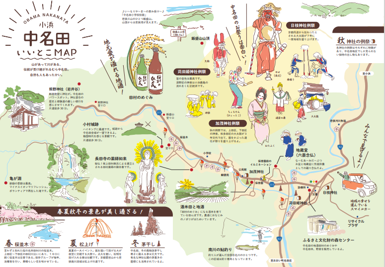 小浜市市制施行70周年市民協働事業の助成を受け、中名田いいとこマップを作成しました。